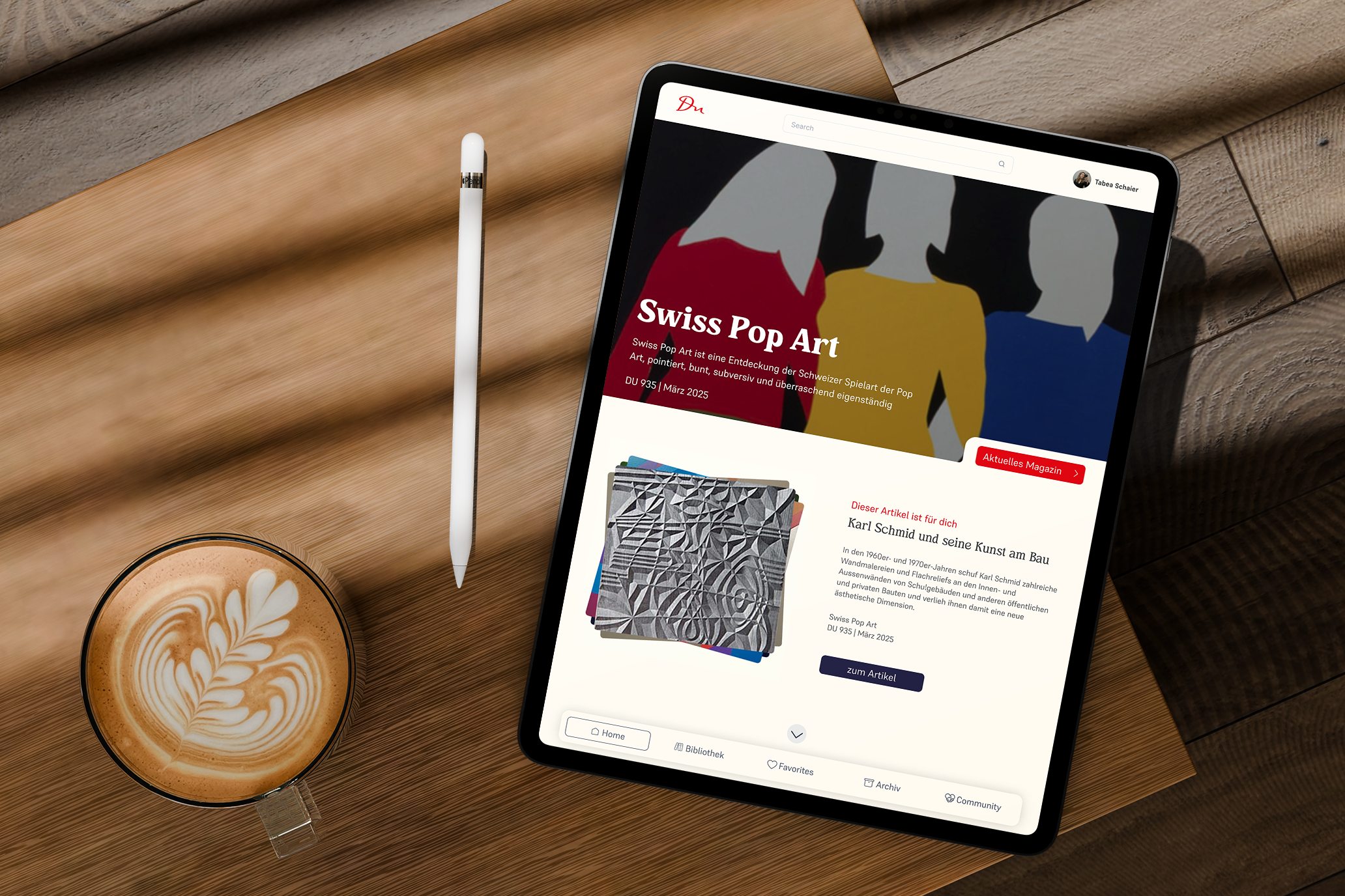 Der personalisierte Home-Screen bildet den zentralen Einstieg in das digitale DU Magazin. Er vereint individuelle Empfehlungen mit aktuellen Künstler:innen und präsentiert Inhalte übersichtlich und strukturiert. So werden redaktionelle Inhalte mit der persönlichen Nutzung verbunden.